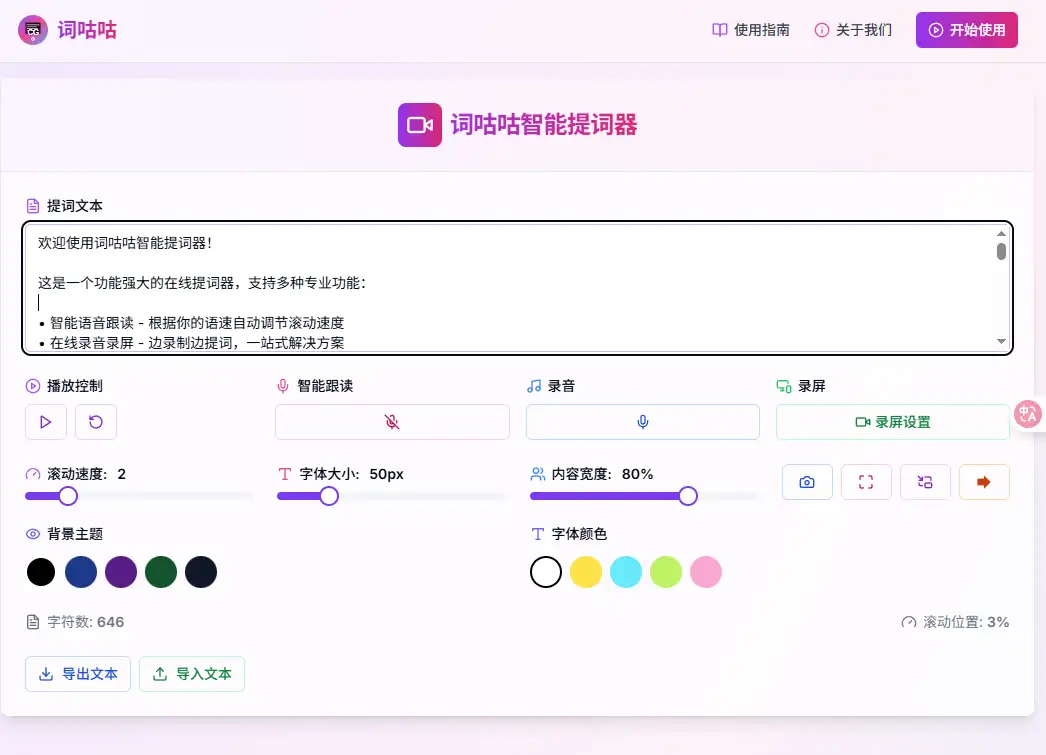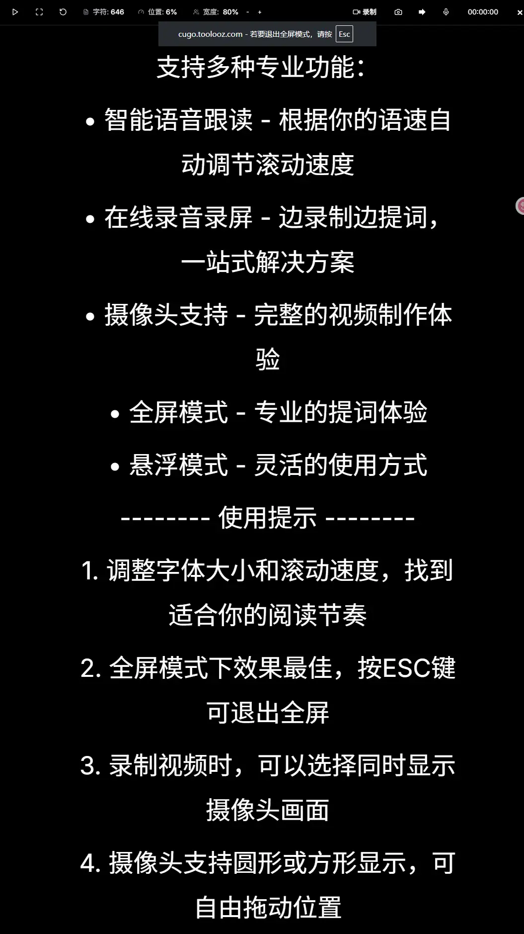 • 一个既美观又实用的在线提词器。不仅要能显示提词文本,还要支持录屏、录音、摄像头等功能,让创作者可以一站式完成所有工作。最重要的是,它必须简单易用,打开网页就能直接用,不需要复杂的注册流程。